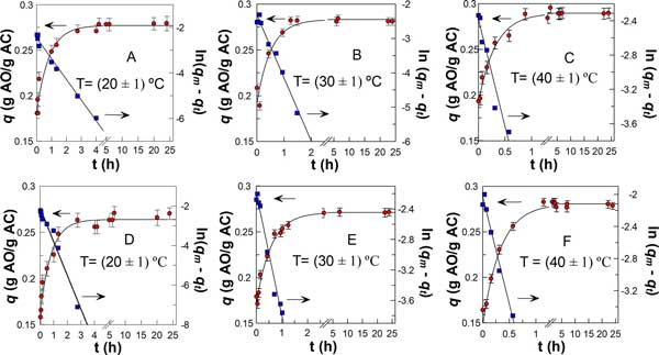 圖1顯示了典型的動力學圖,說明了沒食子酸和沒食子酸丙酯在平衡(q)時每質量活性炭吸附的抗氧化劑的量隨時間的變化。還顯示了在不同溫度下至少三個半衰期(相關系數>0.99)的相應一階圖。在所有情況下,吸附曲線均顯示在4h后達到平衡,并至少維持24h,這是后續研究的時間。