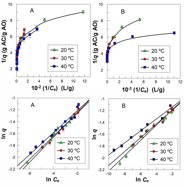 在不同的活性炭量下,評估了溫度(T=20–40°C)對沒食子酸和沒食子酸丙酯吸附過程的影響。實驗吸附平衡數據擬合到兩個等溫線模型,Langmuir和Freundlich方程,并評估了擬合優度。圖2。在研究的交流范圍內獲得了非線性圖。因此,結果表明該模型不適用于描述沒食子酸和沒食子酸丙酯在活性炭上的吸附。注意,在任何給定的活性炭質量下,溫度的變化都會導致沒食子酸和沒食子酸丙酯的吸附能力發生非常小的變化,差異小于2%。