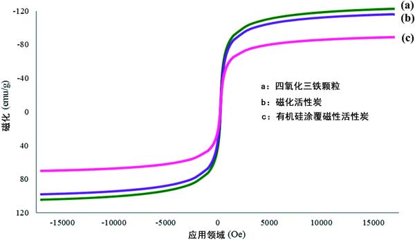 在這項研究中使用VSM來檢查合成活性炭的磁強度。對Fe 3 O 4顆粒,磁性活性炭和機硅涂覆磁性活性炭進行了研究,以研究它們在涂覆時的磁強度趨勢。幾種材料的磁滯回線分別示于圖1(a)-(c)。根據獲得的結果。由于存在非磁性活性炭和有機硅表面活性劑涂層,磁強度似乎下降了。這確認涂覆過程成功。但是,盡管在涂覆最終材料機硅涂覆磁性活性炭時磁化強度降低,但其磁強度仍在可接受的范圍內,并且強度足以在吸附過程中進行。
