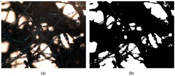 活性炭介質(zhì)250倍放大的顯微照片,然后用數(shù)值計算出與圖像其余部分相比具有較暗陰影的區(qū)域的面積(被活性炭介質(zhì)覆蓋的區(qū)域)。首先,我們使用常規(guī)的多通道和彩色圖像轉(zhuǎn)換為灰度圖像,然后生成圖像,其中每個像素的值均為0(白色像素)或1(黑色像素)(圖1)。接下來,我們應用例程,對于給定的灰度圖像,該例程確定由黑色像素簇覆蓋的整個灰度圖像的比例。這種方法使我們能夠粗略評估活性炭復合材料中活性炭附聚的均勻性,而無需考慮基礎非織造布的不均勻性,因為例程省略了透明PET纖維。