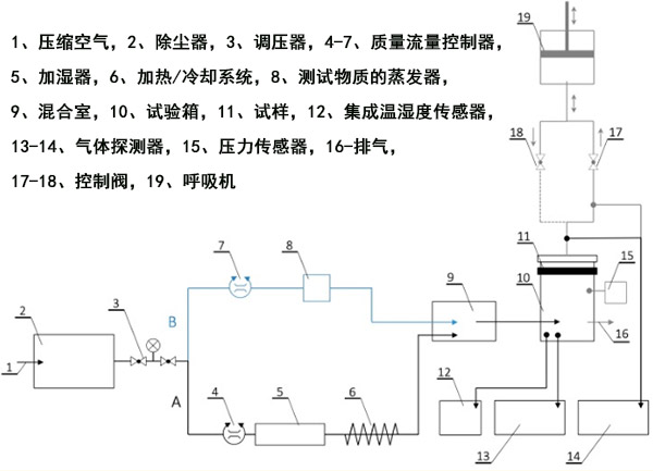 在測試過程中,干燥的壓縮空氣通過裝有減壓器的顆粒過濾器輸送到系統(tǒng)中,該壓力過濾器的調(diào)節(jié)范圍為0-8 bar。然后將其分為兩條線(圖2):用于溫度和相對濕度調(diào)節(jié)的線A和用于調(diào)節(jié)測試室內(nèi)測試物質(zhì)濃度的線B。將來自管線A的給定溫度和相對濕度的空氣與來自管線B的激發(fā)蒸汽在混合室中混合,然后將活性炭鎖定在直徑為11.3的氣動樣品架中,并將其引入測試室。另外,在脈動流測試期間使用了連接到測試室出口的呼吸機。呼吸機設定為25個循環(huán)/分鐘和2 L/沖程,這對應于每分鐘25吸氣和25呼氣,呼吸量為2L。呼吸機的氣流模式為正弦曲線。脈動流量測試期間的挑戰(zhàn)濃度得到補償,以確保將總負載標準化為穩(wěn)態(tài)流量條件。實驗以四個變體進行,每個變體評估不同因素(即挑戰(zhàn)濃度,相對濕度,挑戰(zhàn)流速,挑戰(zhàn)流型)對活性炭復合材料吸附特性的影響。