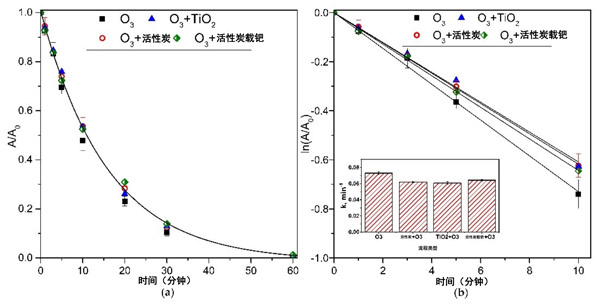 圖2:使用三種類型的催化劑(a)和擬除色率(b)進行臭氧氧化和催化臭氧氧化處理期間的原始(未經預處理)工業廢水。