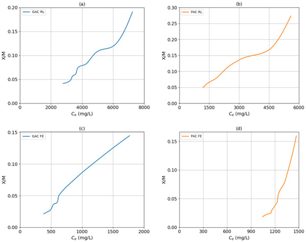 圖1顯示了顆粒活性炭與原浸出液,粉狀活性炭與原浸出液,粉狀活性炭與廢液以及粉狀活性炭與廢液的實(shí)驗等溫線。兩個樣品的曲線和兩個活性炭對應(yīng)于S形的等溫線(II型)的行為,因為曲線是凹向上,所以多層吸附進(jìn)行活性炭的表面上。利用該信息,就滲濾液而言,不管活性炭顆粒的性質(zhì)和大小如何,都可以假定吸附劑中殘留的化學(xué)需氧量是通過物理吸附發(fā)生的。