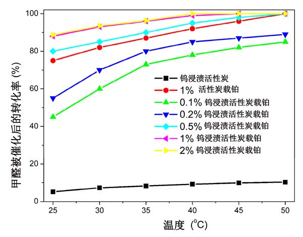 圖2:使用不同的鉑負(fù)載活性炭催化劑,反應(yīng)溫度對甲醛轉(zhuǎn)化率的影響。