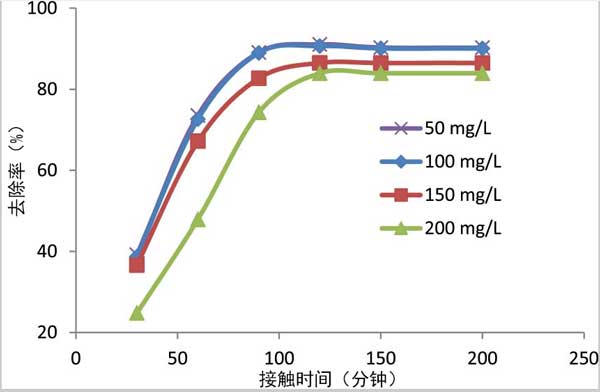 圖2展示了在30°C下各種接觸時間和初始苯酚濃度(50–200mg/L)下苯酚去除率的特征。由于在活性炭上存在空位,所以吸附劑對苯酚的吸收隨時間的推移而改善。開發(fā)了超過水相和固相之間傳質(zhì)阻力的強大驅(qū)動力。這是導致苯酚分子從一開始就迅速吸收的原因,后來在達到平衡之前下降。在平衡狀態(tài)下,由于苯酚分子與吸附劑表面之間的排斥力無法吸附苯酚分子,因此吸附劑的空位無法達到最大苯酚吸收量。苯酚的初始濃度影響除去的苯酚和平衡時間。初始濃度為100mg/L時,最大吸附量為90.06%,而200mg/L時為83.95%。在較低的苯酚初始濃度下(苯酚分子與空位的比率較小),由于活性炭載納米銀材料上存在更多的空位,所以在平衡狀態(tài)下吸附的苯酚量較高。隨著比率隨著初始苯酚濃度的增加而增加,空位容易變得飽和,苯酚分子趨于競爭擴散到內(nèi)部孔中,導致吸附劑表面的吸收百分比降低。從該實驗中,所有濃度的2小時后去除率均無顯著增加。因此,接觸時間(60–120分鐘)和濃度(100–200mg/L)是個好選擇。