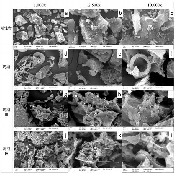觀察圖3所示的圖像,處理期間生物量顯著增加,其中存在大量生物材料,可能的絲狀形成和微生物團聚,表明存在較大量步驟IV中的生物量。至于生物膜的發(fā)展,觀察顯微照片增加了10,000倍(圖3C,3I和3L),注意到附著在活性炭表面的微生物的生長。這些可能是細菌,真菌和絲狀細菌,活性炭在反應(yīng)器運行110天后,固體樣品中的細菌含量更高。