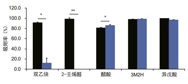 圖2: 活性炭和氧化鋅對異味揮發性有機化合物的吸附能力。黑色和藍色條分別表示活性炭和氧化鋅。