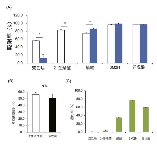 圖3:活性炭對產生異味的揮發性有機化合物的吸附能力。(A)改性活性炭和氧化鋅的吸附水平。(B)使用相同含量的活性炭和改性活性炭,比較改性活性炭和活性炭的二乙酰基吸附水平。(C)二氧化鈦對各種VOC的吸附水平。