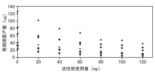 測試過程中我們在無炭和以20毫克至120毫克的六種重量增量添加活性炭來測試香煙。桿端和嘴端的醋酸纖維素長度段始終保持恒定。最大的空腔填充值用于所有負載,因此,總的過濾器長度增加了約50%。每使用15毫克活性炭增加1毫米。如前所述,所有香煙都在35/2/60的條件下進行調理和抽煙。每個濾嘴負載量高為120mg時添加活性炭對焦油和尼古丁的收率(即顆粒相)的影響很小,這可能是由于較長的濾嘴導致了額外的機械過濾。對于所有測得的蒸氣,隨著活性炭載量的增加,產率都有所下降。這在圖1中以圖形方式顯示(僅出于清晰目的使用一定范圍的蒸氣),其中乙醛/丙酮值乘以0.1以進行縮放。