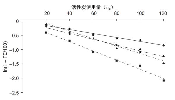 我們測試了增加活性炭微孔體積的效果,以及中孔和大孔的添加。對煙氣量的影響,在圖3中進行了描述。從圖可看出,增加微孔的數量會導致更大的吸附并因此降低煙氣的產生。中孔/小大孔的加入通過改善向微孔的運輸而導致吸附增強。很明顯,使用微孔/中孔活性炭會導致速率常數的增加,通常增加了約20倍。