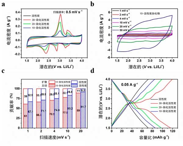 圖2:活性炭和活性炭雜化物在1.5至4V的半電池測(cè)試中的電化學(xué)性能。(a)所有樣品在0.5mV s-1的掃描速率下的循環(huán)伏安(CV)曲線,(b)活性炭雜化物1至50mV s-1之間的不同掃描速率下的CV曲線,(c)活性炭雜化物的擴(kuò)散控制法拉第過程和電容過程的貢獻(xiàn)率,(d)在0.05A g-1的電流密度下所有樣品的恒電流充/放電(GCD)曲線。