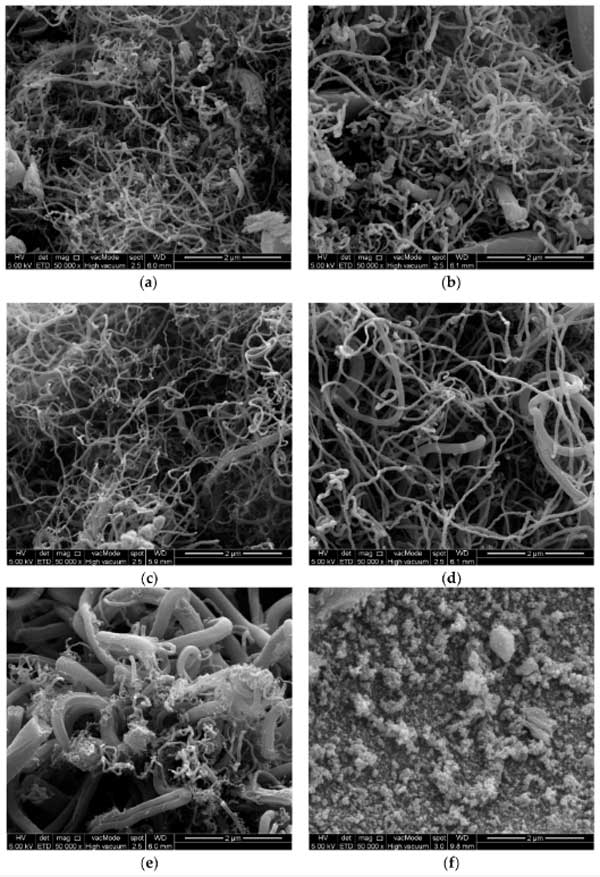 用FESEM技術(shù)分析了合成樣品的形態(tài)特征。圖2a-f顯示了放大的50,000倍的六個(gè)選定活性炭樣品圖像。圖2c顯示了活性炭5的FESM圖像,通過使用5%的鐵作為單催化劑和40分鐘的反應(yīng)時(shí)間,發(fā)現(xiàn)炭產(chǎn)率和接觸角較高。在此樣本中發(fā)現(xiàn)了兩種類型的碳納米材料,分別是碳納米纖維和多壁碳納米管。圖2f顯示了活性炭3的FESEM圖像,該圖像是通過使用4%的鈷作為單催化劑和40分鐘的反應(yīng)時(shí)間制備的。發(fā)現(xiàn)僅使用大量的鈷作為催化劑產(chǎn)生非常差的炭產(chǎn)率,這表明材料制備得不怎么好。圖2e顯示了活性炭4的FESEM圖像,該圖像是通過使用5%的鐵和4%的鈷作為雙金屬催化劑制備的,反應(yīng)時(shí)間為40分鐘。該圖像表明,使用大量的鈷和鐵時(shí),主要生成聚集的炭納米材料和碳納米纖維,因?yàn)檫@樣的實(shí)驗(yàn)條件不是優(yōu)選的。